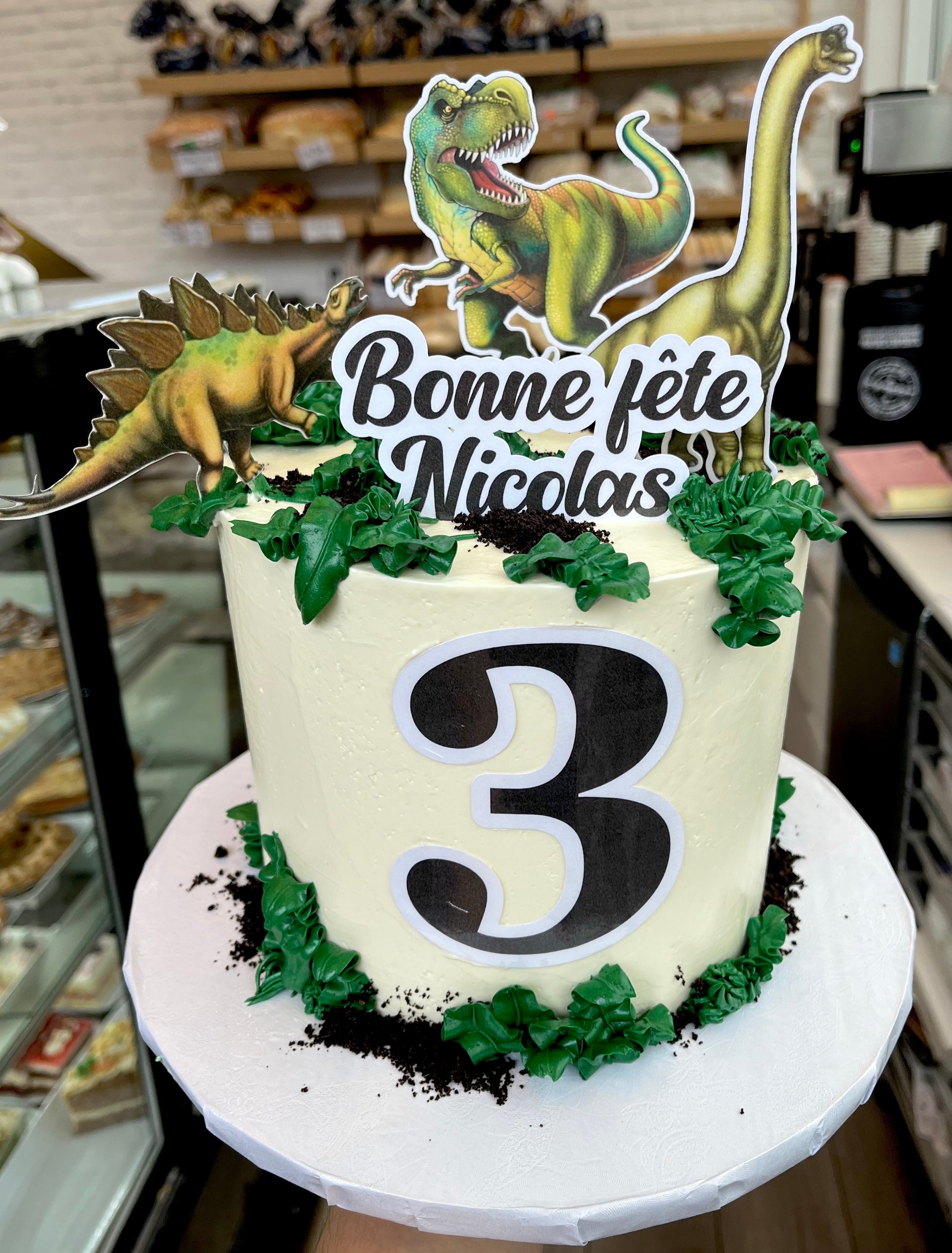 Cherchez un topper de gâteau original pour l'anniversaire de votre petit fan de dinosaures ? Ce modèle personnalisable est parfait ! Représentant un dinosaure style Jurassic Park, il est multicolore et attrayant pour les enfants. Vous pouvez ajouter le prénom et l'âge de l'enfant (instructions dans l'annonce).