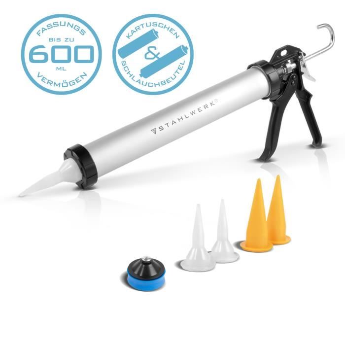 Il a une force de poussée énorme (300 kg !) et 4 vitesses réglables, ce qui te permet de doser parfaitement le débit, même avec des produits très visqueux. Il accepte les cartouches standard de 300ml. Le corps est en ABS, couleur bleu.