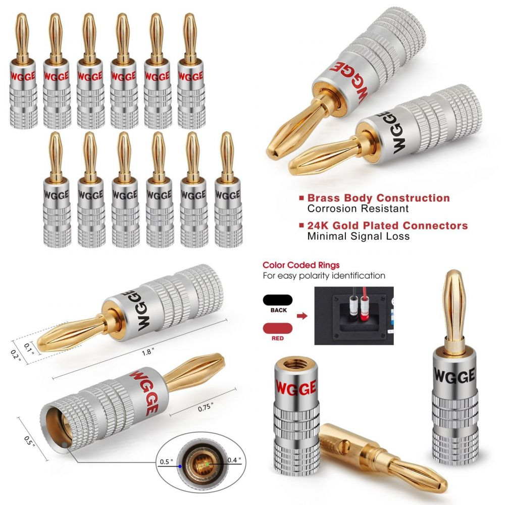 Pour améliorer la connexion de vos enceintes Hi-Fi ou home cinéma ! Ces 6 paires (donc 12 connecteurs) de bornes bananes WGGE sont plaquées or 24 carats, ce qui assure une excellente conduction du signal et une résistance à l'oxydation. Le système à double vis permet une fixation ultra-solide des câbles. Le modèle est WG-009. Elles sont neuves, dans leur sachet d'origine. Très facile à installer sur la plupart des amplis ou enceintes qui acceptent ce type de connecteur. Parfaites pour remplacer des bornes défectueuses ou pour monter un système tout neuf. UPC : 650327851962. Un petit accessoire qui peut faire une grande différence sur la qualité sonore ! Livraison rapide.