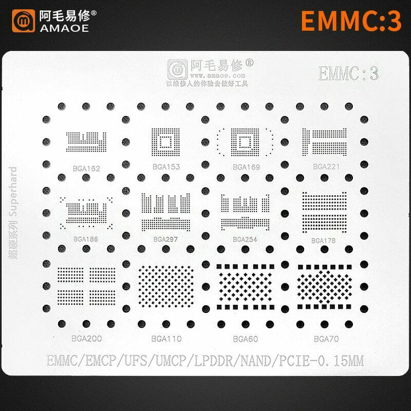 Si tu fais de la réparation électronique, ce pochoir de reballing va te sauver la vie. Conçu pour les puces EMMC en BGA (162, 153, 169, 221, etc.), il permet de réappliquer des billes d'étain de manière précise. En maille, il facilite le travail sur les cartes mères de smartphones, tablettes ou autres PCB. Le produit est neuf, dans son emballage. Marque générique, mais très utilisé par les réparateurs pro. Un outil indispensable pour qui veut réparer des composants soudés en BGA !