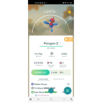 Pour les dresseurs Pokémon GO qui visent l'excellence ! Cette annonce concerne un Porygon-Z (le Pokémon #474 de la région de Sinnoh, 4ème génération) avec une Puissance de Combat (CP) supérieure à 2000. Le Pokémon est en état \comme neuf\. Il s'agit très probablement d'un compte Pokémon GO ou d'un échange organisé via le jeu (le vendeur précise de bien regarder toutes les images de l'annonce pour les instructions). Porygon-Z est un Pokémon Normal rare et puissant, évolué de Porygon2, très utile dans les combats de ligue. Si vous cherchez à compléter votre Pokédex avec un spécimen fort, ou à renforcer votre équipe pour les raids et le combat de maître, cette offre pourrait vous intéresser. Attention, assurez-vous de bien comprendre le processus de transaction (qui implique souvent un échange ami dans le jeu) et respectez les conditions de service de Pokémon GO.