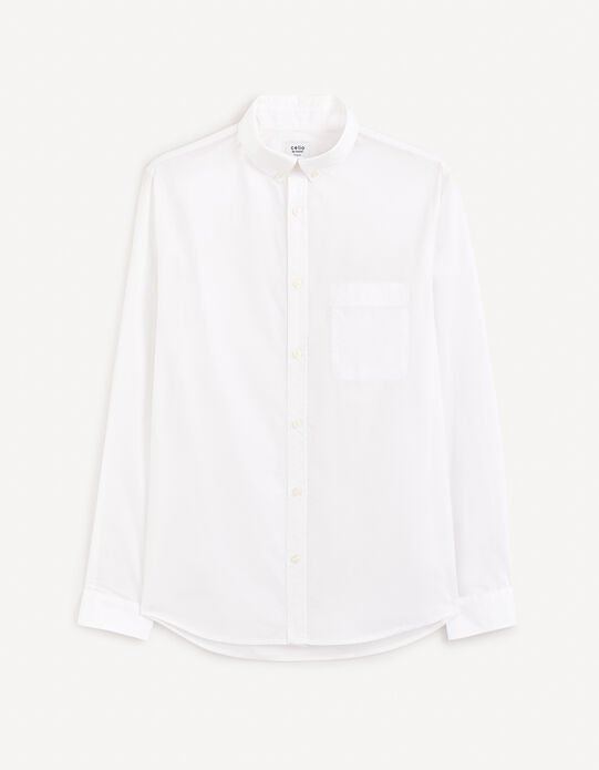 Pour une tenue professionnelle ou smart casual ! Cette chemise homme Simon Jersey est en mélange polycoton (coton et polyester), un tissu qui résiste aux froissures (non-iron) et est facile d'entretien. Coupe classique (regular fit), col boutonné pour plus de tenue, manches longues. Coloris blanc avec fine rayure (striped). Lavable en machine. Neuf avec étiquettes. Idéale pour le bureau, les rendez-vous clients, ou les occasions nécessitant un look soigné sans être trop formel. S'adapte à toutes les saisons. Une pièce basique et fiable de toute garde-robe masculine. Portez-la avec un costume ou un simple jean !