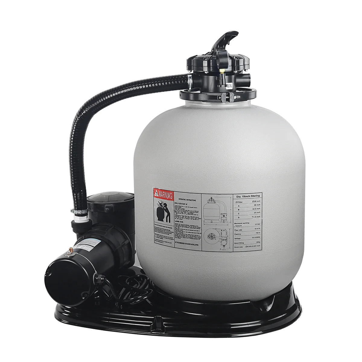 La pompe fonctionne sur du 115V (standard US), avec un débit de 4500 gallons par heure. Le filtre est en PE résistant, avec une vanne multivoies (filtration, rinçage, égout, circulation, arrêt) pour un entretien facile. Couleur grise, dimensions environ 30,5 x 28 x 19,5 pouces. Fabriqué en Chine. Neuf, en boîte, avec manuel.