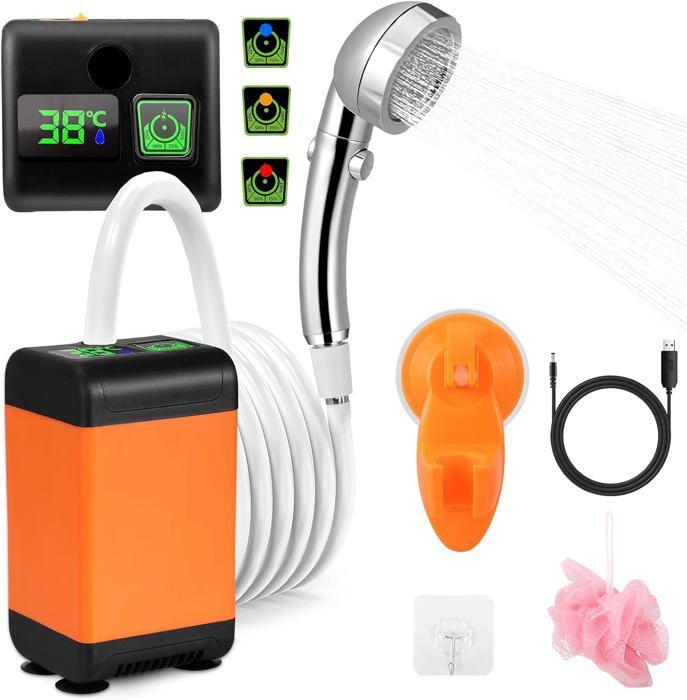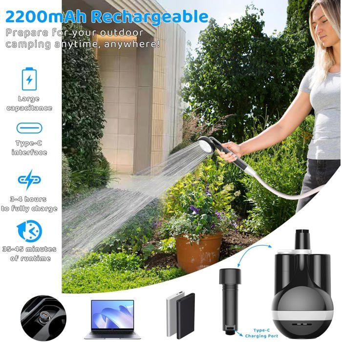 Prenez une douche fraîche n’importe où avec cette pompe de douche portable ! Batterie intégrée 2200mAh rechargeable par USB, autonomie longue. Parfaite pour le camping, la randonnée, les festivals, la plage, le vanlife. Design compact et léger, en plastique, acier inox et chrome. Facile à fixer sur un bidon d’eau. Débit correct, pression réglable. Marque non spécifiée, garantie 1 an, fabriquée aux États-Unis. Couleur blanche, look propre. Idéale pour se rafraîchir après une randonnée ou en bivouac. Étanche partiellement (éviter immersion). Inclut généralement le tuyau et la pompe. Un must pour les amateurs de plein air qui aiment le confort minimal. Livrée neuve dans son emballage. L’hygiène en voyage, simplifiée !