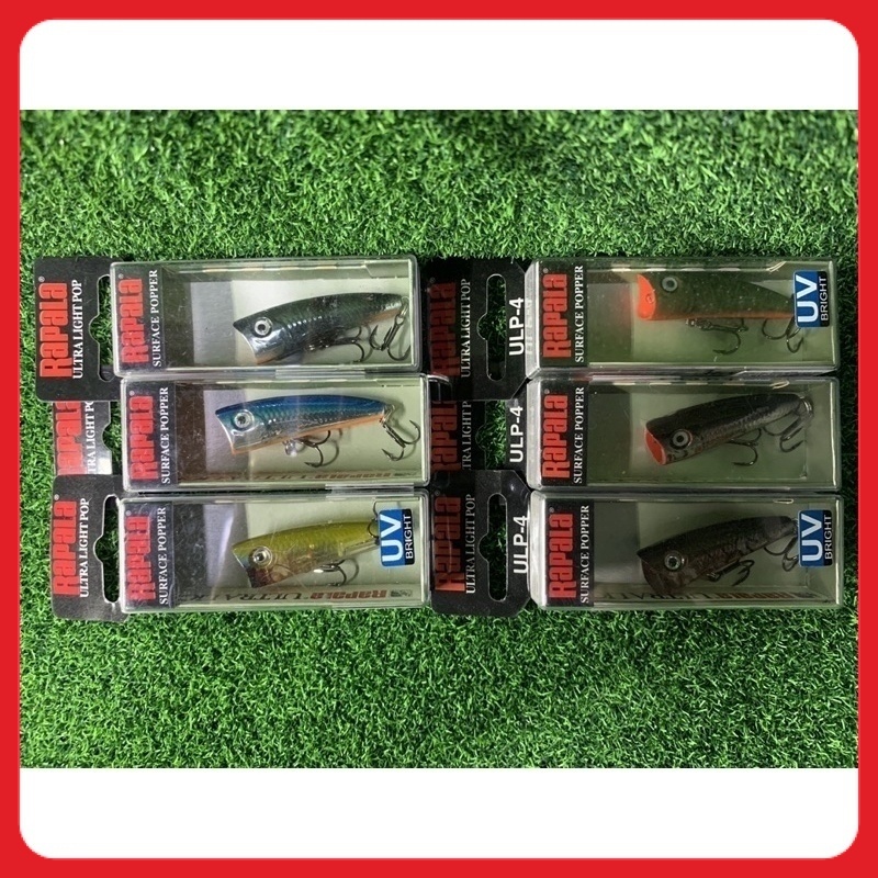 Coucou les pêcheurs ! Un petit leurre qui va faire des ravages : le Rapala Ultra Light Pop, référence ULP04. Il mesure 4 cm pour seulement 3 grammes, c'est du vrai matériel ultralight. C'est un leurre de surface (wobbler) qui fait un bruit de \pop\ caractéristique pour attirer les carnassiers en eau douce. Il est neuf, sous blister d'origine. La forme est celle d'un petit poisson, et il existe en plein de couleurs – vérifie avec le vendeur celles disponibles. Parfait pour la pêche de la truite, du black-bass, du brochet en petit gabarit, ou de la perche dans les petits spots. Sa petite taille et son action de surface en font un tueur quand les poissons sont actifs près de la surface. Vendu à l'unité. Rapala, c'est une marque de confiance, la qualité est là. Si tu aimes la pêche légère en rivière, en étang, ou en lac, ce Ultra Light Pop est un must-have dans ta boîte. Livraison rapide, produit garanti neuf. Prépare-toi à des touches explosives !