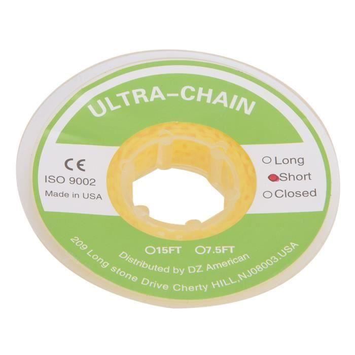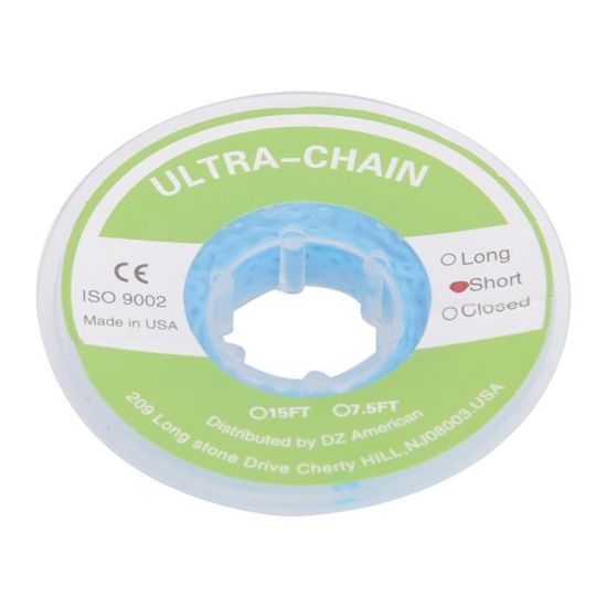 Ces chaînes élastiques (power chains) sont utilisées en orthodontie pour déplacer les dents de manière contrôlée. Elles se présentent en bandes courtes, longues ou continues, en caoutchouc hypoallergénique, et sont conçues pour être placées sur les brackets de votre appareil dentaire.\n\nLe lot est neuf, sous emballage d'origine, fabriqué en Chine. Idéal pour les patients qui ont besoin de remplacements entre deux rendez-vous chez l'orthodontiste, ou pour les professionnels qui souhaitent avoir un stock d'accessoires.\n\nElles exercent une pression douce mais constante pour corriger l'alignement ou fermer les espaces. À utiliser uniquement selon les instructions de votre orthodontiste – ne les remplacez pas sans conseil.\n\nParfait pour maintenir le traitement à domicile. Lavage facile à l'eau claire. Attention : ces produits peuvent contenir des substances soumises à la réglementation Prop 65 en Californie.\n\nUn petit accessoire qui fait une grande différence dans le succès de votre sourire !