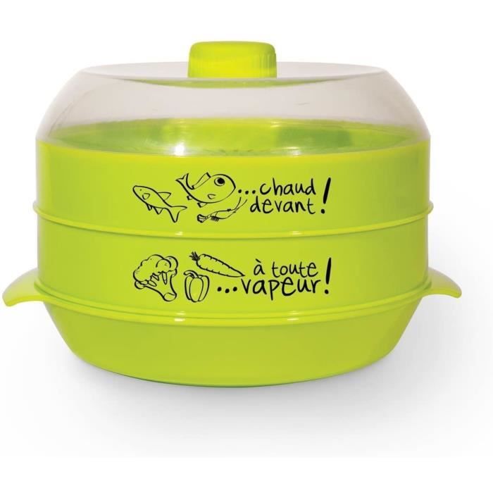 Salut les pressés qui veulent manger sain ! Ce cuiseur vapeur pour micro-ondes va révolutionner tes repas. Il te permet de cuire à la vapeur des légumes, du poisson, du riz, de la volaille... directement au micro-ondes, en quelques minutes seulement. Plus besoin de casserole ni de surveillance. Il est en plastique SANS BPA (donc plus sain), de couleur rouge. Le modèle est le 839 de la marque Dependable Industries Inc. (UPC: 097958171401). Dimensions compactes : moins de 25 cm de long et 13 cm de haut environ. Il est neuf, dans sa boîte. Le principe est simple : tu mets un peu d'eau au fond, les aliments dans le panier vapeur, et tu passes le tout au micro-ondes. Une solution hyper pratique pour les étudiants, les célibataires, les gens au bureau, ou pour préparer rapidement un accompagnement sain. Facile à nettoyer (généralement lavable au lave-vaisselle). Un accessoire de cuisine malin, économique en énergie et qui préserve les nutriments. Parfait pour adopter une alimentation plus équilibrée sans y passer des heures.