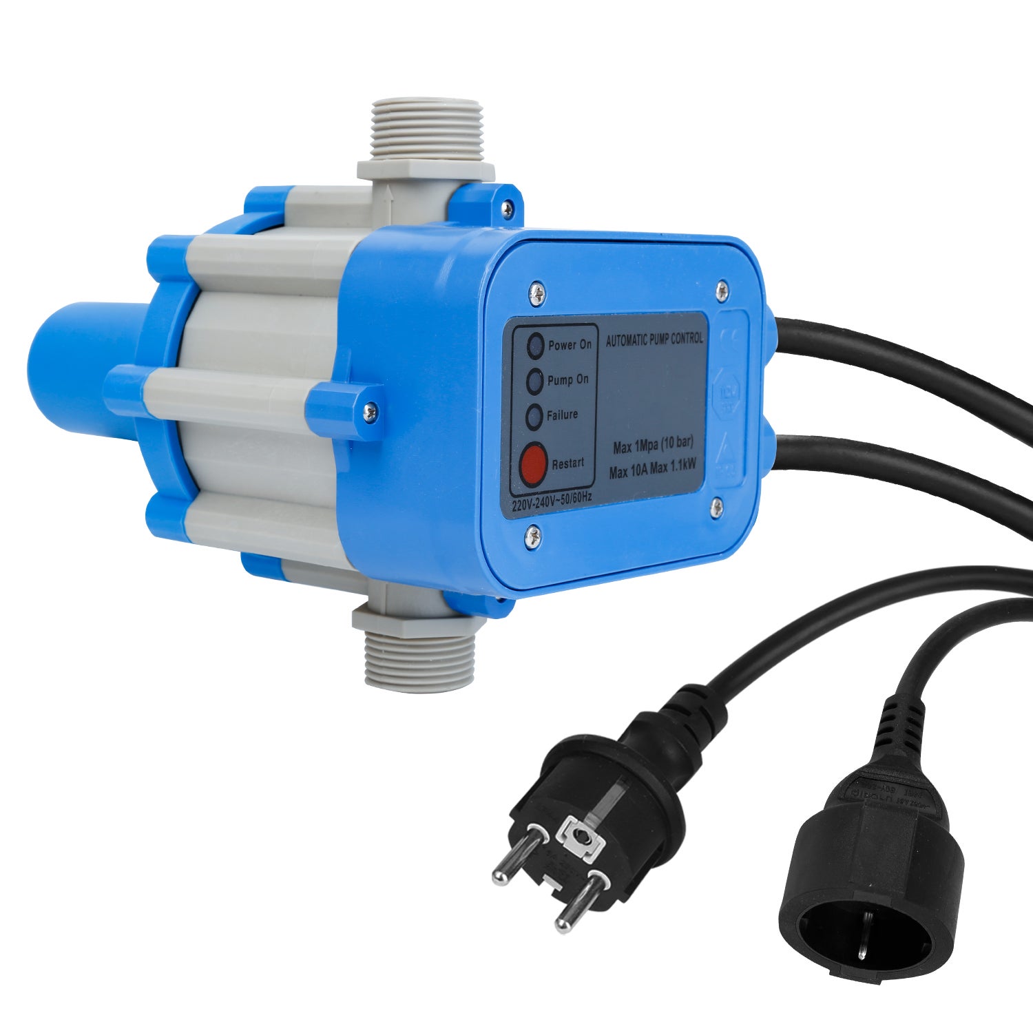 Caractéristiques électriques : 230V (220-240V) monophasé, courant max 10(6)A. Il a une fiche mâle et femelle intégrée pour un branchement facile entre la prise et la pompe.