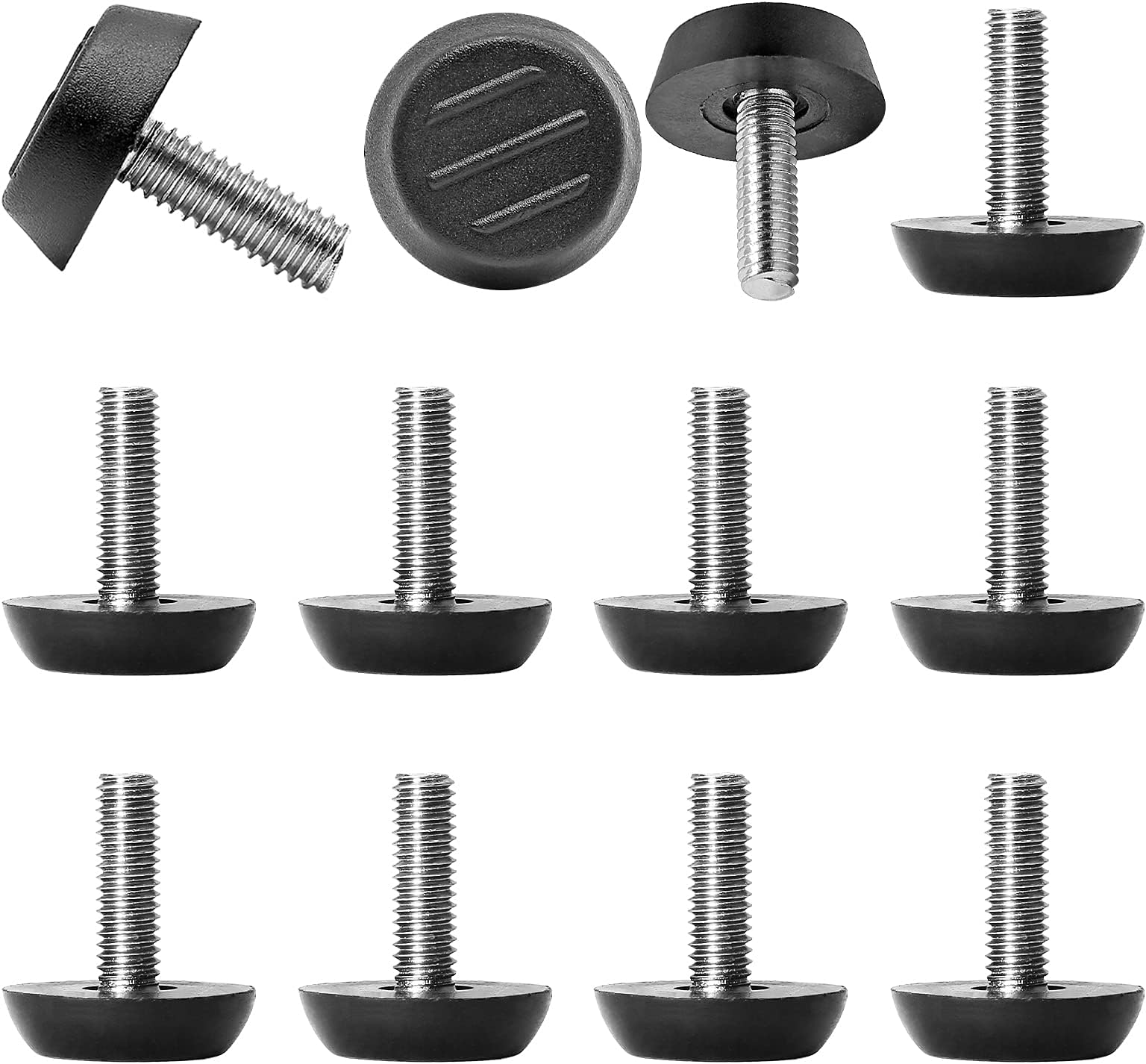 Un lot de 12 pieds réglables, parfaits pour stabiliser une table bancale, un meuble, une machine-outil, ou même un châssis électronique. Ils sont en plastique solide (ou nylon), avec une vis en métal M6. Tu les fixes sous les pieds de ton meuble, et tu tournes pour ajuster la hauteur (jusqu’à environ 30 mm). Dimensions : diamètre 25 mm, hauteur maxi 30 mm, filetage M6. Le lot fait 175 g. C’est neuf, bien emballé. Super utile en atelier, en cuisine pour les plans de travail, en salon pour la table basse, ou en bricolage pour caler un appareil. Ils absorbent aussi les vibrations. Attention : produit conforme à la prop 65 californienne (certains matériaux peuvent contenir des substances à risque en cas de forte exposition – info légale standard). Bref, des petits pieds malins qui évitent bien des galères !
