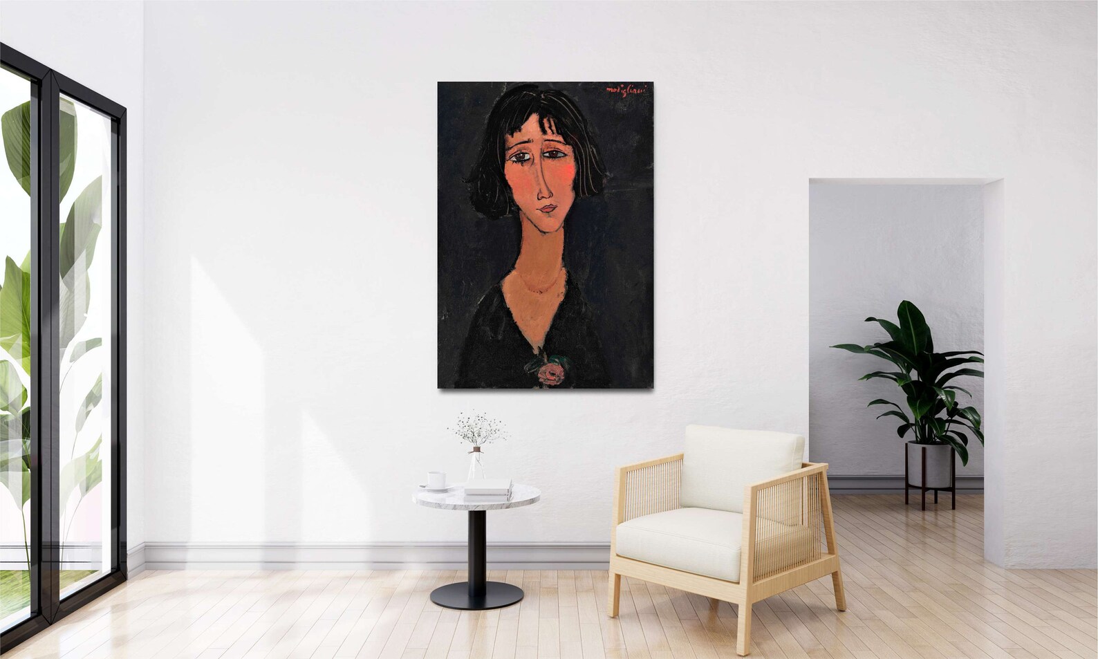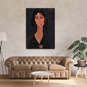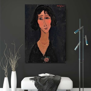 Amateur d'art classique et d'ambiance chic ? Cette reproduction officielle (licensed reprint) du célèbre tableau \Jeune femme à la rose\ d'Amedeo Modigliani est faite pour vous. Imprimée en technique Giclée sur une vraie toile d'artiste, elle offre des couleurs riches et des détails fidèles à l'œuvre originale. Vous pouvez la choisir encadrée ou non, selon votre préférence. Sujet : nu artistique. Style : réalisme. Elle est fabriquée à la main au Royaume-Uni, ce qui garantit une belle finition. Parfaite pour ajouter une touche de sophistication à votre salon, bureau ou chambre. C'est une pièce neuve, prête à être accrochée. Une belle manière d'avoir un morceau d'histoire de l'art chez soi sans se ruiner.