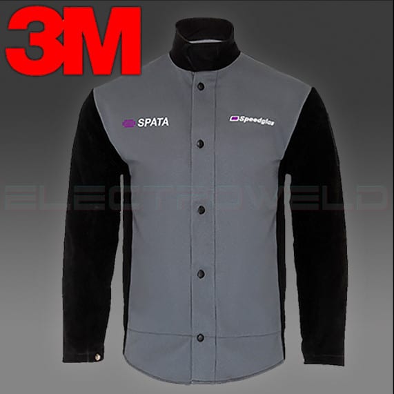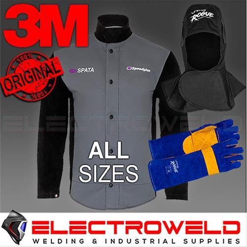 La veste est le modèle Spata, en taille L. Elle est en coton résistant aux flammes, de couleur noire, pour te protéger des étincelles et de la chaleur radiante. Les gants sont du modèle Rogue, conçus pour la soudure. Et la cagoule Speedglas protège ton visage et tes yeux des rayonnements nocifs.