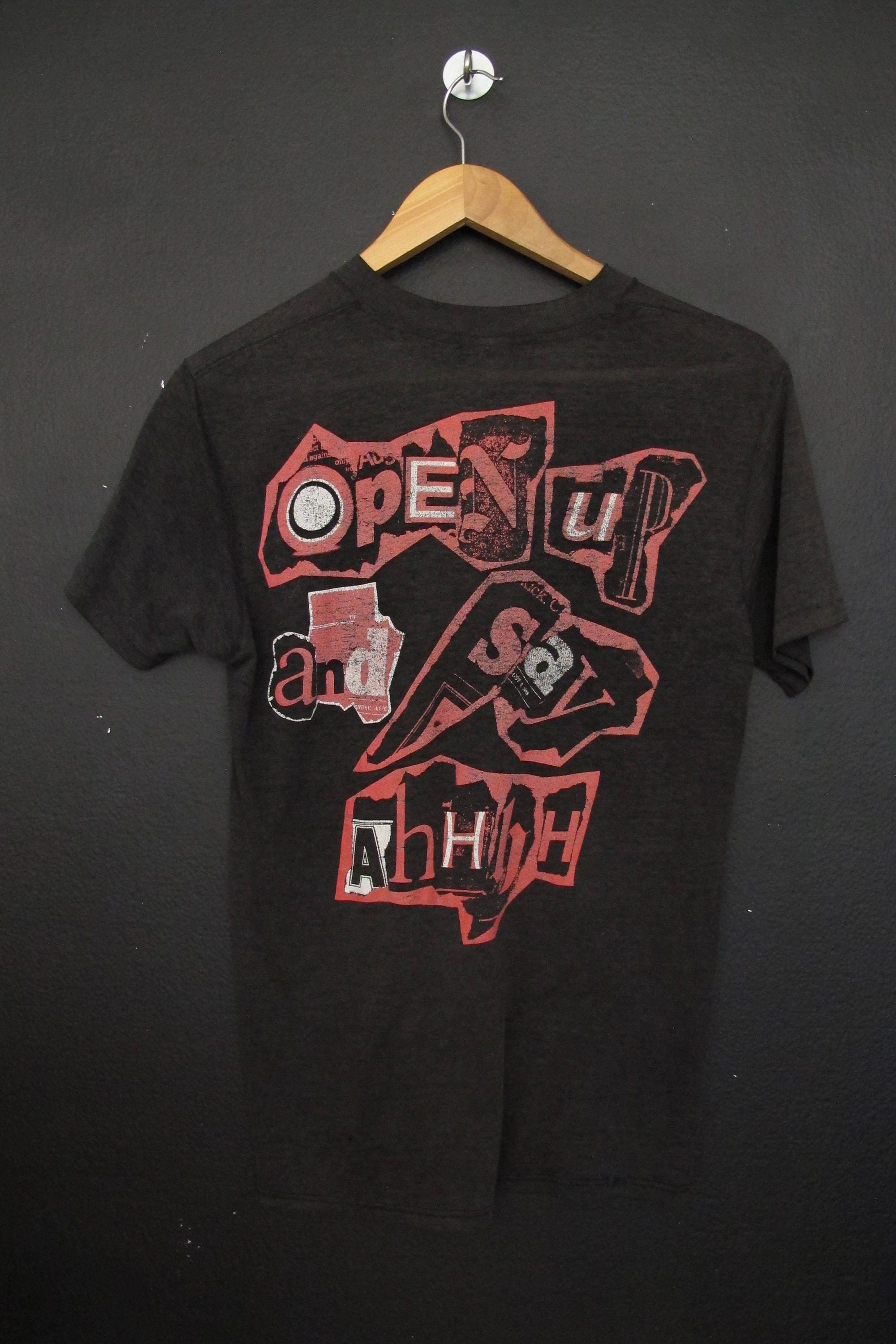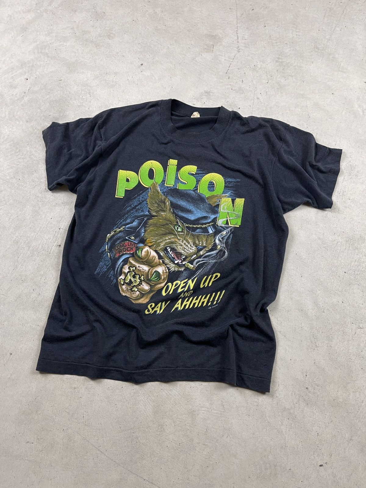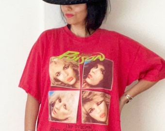 Fans de hard rock et de glam metal des années 80, ce t-shirt est pour vous ! Il reprend le design de la tournée/album \Open Up And Say Ahh!\ du groupe Poison, sorti en 1988, avec probablement le visuel \banned\ (censuré) iconique qui a fait scandale à l'époque. Le t-shirt est neuf, encore avec ses étiquettes, en coton confortable, coupe classique, manches courtes, col rond. Il est unisexe (adultes), et semble être basé sur le modèle Gildan 5000, connu pour sa durabilité. Fabriqué aux États-Unis. Parfait pour afficher ton amour du rock rétro, pour un concert, une soirée déguisée, ou simplement dans la vie de tous les jours. Le design multicolore est accrocheur et parle à tous ceux qui ont grandi avec \Every Rose Has Its Thorn\ et \Nothin' But a Good Time\. Un cadeau idéal pour un ami rockeur ou pour te faire plaisir. Porte-le avec un jeun et des baskets pour un look décontracté et plein d'attitude !