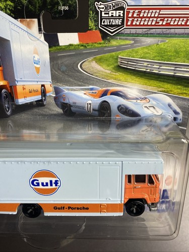 Les collectionneurs de Hot Wheels, voici une pièce rare ! Le Team Transport Gulf avec la Porsche 917 LH et son camion Fleet Flyer, aux couleurs bleu et orange iconiques. Échelle 1:64, en diecast de qualité. Boîte jamais ouverte, édition limitée de la série Hot Wheels Car Culture. Parfait pour les fans de Porsche, de motorsport, ou pour offrir à un passionné. Convient aux enfants à partir de 3 ans (sous supervision) et aux adultes collectionneurs. Un vrai morceau d'histoire automobile en miniature. Ne manquez pas cette occasion d'ajouter un joyau à votre vitrine. C'est neuf, intact, et prêt à être exposé !