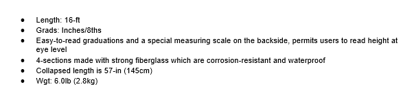 Bonjour les pros du BTP et les bricoleurs sérieux ! Une tige de nivellement (ou mire) SitePro, en fibre de verre, longue de 16 pieds (environ 4.88 mètres). Graduée en pouces, elle est légère, résistante à l'humidité et ne conduit pas l'électricité. Référence 11-SCR16-C. Parfaite pour les travaux de terrassement, de maçonnerie, de voirie, ou pour utiliser avec un niveau laser. Elle est neuve, dans son emballage. Si tu as besoin de prendre des mesures précises sur de longues distances, cette tige est un outil fiable. Livraison soignée. Attention, longue pièce, prévoir un espace de réception adapté.