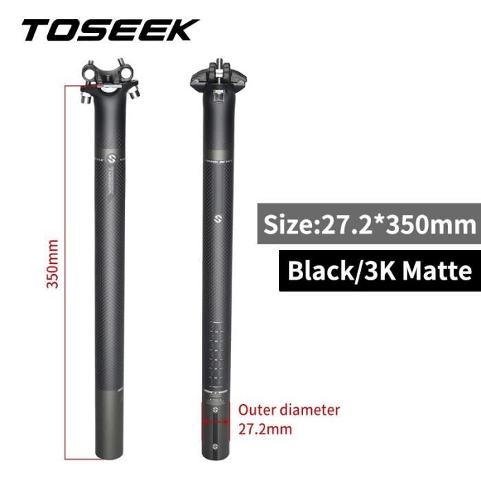 Tu veux alléger ton vélo et gagner en confort ? Cette tige de selle en fibre de carbone TOSEEK est un excellent upgrade ! Elle est légère (entre 220g et 250g), rigide et absorbe bien les vibrations. Choisis ton diamètre : 27.2 mm, 30.8 mm ou 31.6 mm (le diamètre du tube de ton cadre). Choisis aussi ta longueur : 350 mm ou 400 mm. Charge max : 260 livres (environ 118 kg). Noire, mate, look sobre et pro. Elle est universelle, donc compatible avec VTT, route, ville, etc. Garantie 1 an. Neuf, jamais montée. Le montage est simple, il faut une clé Allen. Tu sentiras vraiment la différence par rapport à une tige en aluminium. Améliore les performances et le plaisir de rouler. Livraison depuis la Chine. Vérifie bien le diamètre de ton cadre avant de commander !