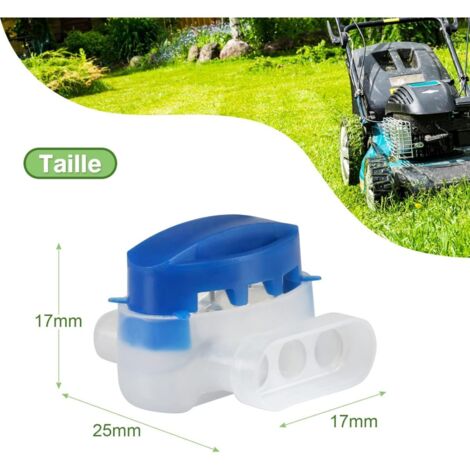 Votre robot tondeuse a sectionné son câble périmétrique ? Ces connecteurs rapides étanches sont la solution pour réparer sans soudure ! Conçus pour les câbles de guidage des robots tondeuses. Ils sont de type \Scotchlok\ ou similaire, bleus, avec 3 entrées. Compatibles avec des câbles de section 22-14 AWG (0,5 à 1,5 mm²), diamètre max avec isolation 3,9 mm. Matériau : nylon ignifugé, contacts en laiton. Il suffit d'insérer les fils dénudés et de presser le connecteur avec une pince pour créer une connexion étanche et résistante. Disponible en lots de 5, 10, 20 ou 30 pièces. Produit neuf. Idéal pour réparer rapidement une coupure et remettre votre tondeuse autonome en service. Gardez-en toujours quelques-uns dans votre garage !