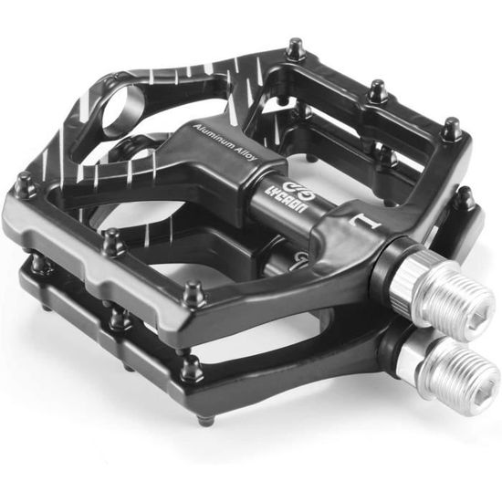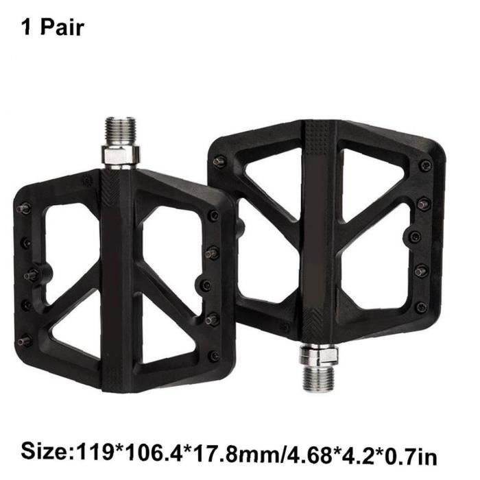 Équipez votre VTT, votre vélo de trekking ou de descente avec ces pédales plates robustes et pratiques ! Fabriquées en alliage d'aluminium noir, elles offrent une large plateforme de 126mm de long sur 106mm de large, pour un bon support du pied et une stabilité accrue, même sur les terrains techniques. La surface est recouverte de picots antidérapants pour maintenir votre chaussure en place. Le système d'axe tourne sur des roulements étanches (cartridge bearings) pour une rotation fluide, durable et nécessitant peu d'entretien. Ces pédales sans marque sont compatibles avec la plupart des vélos (filetage standard 9/16\). Parfaites pour les pratiquants de trial, de descente, ou tout simplement pour les cyclistes qui préfèrent le confort et la liberté des pédales plates aux cale-pieds. Montage simple avec une clé plate. Un excellent rapport qualité-prix pour remplacer des pédales usées ou améliorer l'équipement de base de votre vélo. Prêtes à affronter la boue et les chocs !