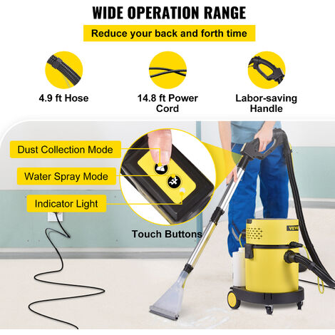 Coucou ! Besoin d'un aspirateur puissant qui fait aussi le lavage ? Découvrez cet aspirateur-laveur 4 en 1 de la marque VEVOR. Il aspire le sec ET l'humide, avec une capacité de 20 litres (5.3 gallons) et une puissance de 1200W. Il est équipé d'un filtre HEPA et d'un filtre éponge pour une bonne filtration. Compact et portable (45x39x56.5 cm), il a une puissance d'aspiration de 17 Kpa. Fonctionne sur 220V, avec un câble de 4.5 m et un tuyau de 1.5 m. Il a 5 brosses, un écran LCD rétroéclairé, et même une télécommande ! La couleur est jaune, très visible. Parfait pour le nettoyage intensif dans l'atelier, le garage, ou après des travaux. Fabriqué en Chine, modèle VV-VC-220V. Neuf dans son carton d'origine. Un outil professionnel à prix malin !