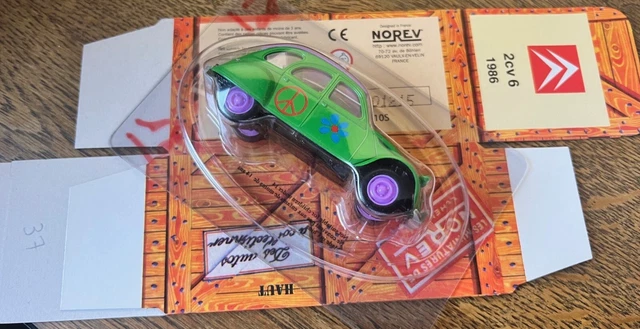 Un véritable morceau de folklore roulant ! Cette miniature au 1/43e reproduit fidèlement une Citroën 2CV décorée aux couleurs hippies \Peace and Love\. C'est une édition du fabricant réputé Norev, distribuée par Jumajo. Elle est neuve, dans sa boîte, et les détails sont soignés. Parfaite pour les collectionneurs de modèles réduits français, les amoureux de la 2CV, ou simplement pour ajouter une touche rétro et joyeuse à votre déco. L'échelle 1/43 est idéale pour l'exposition sans prendre trop de place. Une pièce qui fait sourire et qui rappelle l'esprit libre des années 70. Un cadeau idéal pour un fan d'automobiles insolites ou d'époque. Prêt à faire entrer un peu de paix et d'amour dans votre vitrine ?