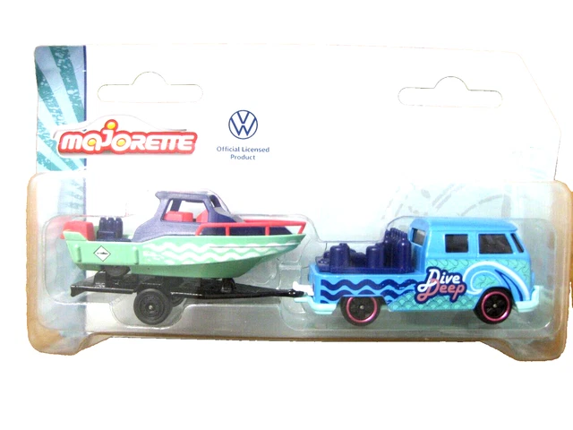 Les enfants (et les collectionneurs !) vont adorer ce set Majorette : il représente un Volkswagen T6 Multivan (modèle 2015) tirant une remorque sur laquelle est fixé un bateau de surf coloré. Tout est à l'échelle 1:64, donc de la taille classique des petites voitures. Les véhicules sont en métal die-cast, solides et bien détaillés, avec des peintures vives. Le T6 a des roues qui roulent, et la remorque est amovible. C'est un jouet neuf, dans sa boîte originale non ouverte (parfaite pour offrir), fabriqué en Thaïlande en 2021. Recommandé à partir de 3 ans, il convient aux garçons et aux filles, et plaît aussi aux adultes fans de Volkswagen ou de modèles réduits. Idéal pour inventer des histoires de vacances à la plage, de transport d'équipement de sport... Bref, pour des heures de jeu imaginatif. Un set complet, ludique, et de belle qualité pour un prix raisonnable. Parfait sous le sapin ou pour compléter une collection Majorette.