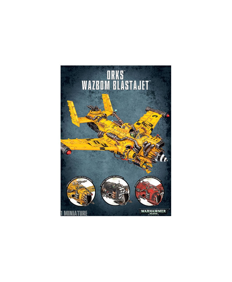 Pour les Waaagh! en préparation ! Voici le Wazbom Blastajet, un véhicule aérien impressionnant pour ton armée d'Orks dans Warhammer 40,000. Cette boîte est toute neuve, jamais ouverte, directement des usines de Games Workshop. À l'intérieur, tu trouveras toutes les pièces en plastique à sprue pour assembler ce gros biréacteur ork, ainsi que son socle de vol. La figurine est non assemblée et non peinte, tu as donc toute la liberté pour la monter et la customiser à ta guise. Référence Games Workshop : 50-32. Fabriqué au Royaume-Uni. UPC : 5011921071685. Un ajout de taille pour écraser les hummies et autres faibles ! Parfait pour compléter ta collection Orks ou pour débuter une nouvelle force. Prépare ta colle et tes pinceaux !