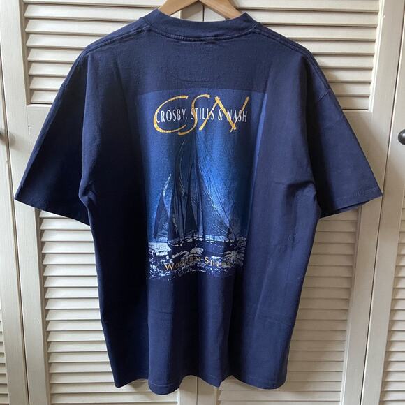 Salut les fans de rock ! Si tu kiffes Crosby, Stills & Nash, ce t-shirt est pour toi. Il reprend le design de leur tournée 'Live It Up World Tour', en blanc, en 100% coton, coupé classique. C'est une reproduction (pas un original d'époque), mais la qualité est là, et le look est top. Les tailles vont du S au 4XL, donc tout le monde peut en profiter. Parfait pour un concert, un festival, ou juste pour afficher ton bon goût musical au quotidien. Il est fabriqué aux États-Unis, et le modèle est CB153. Côté entretien, lavage machine tranquille. Si tu cherches un basique confortable qui parle aux vrais amateurs de classic rock, fonce. C'est simple, efficace, et ça fait toujours son effet. Un must-have pour compléter ta collection de merch rétro. Livraison rapide, et prêt à porter ta passion sur le dos !