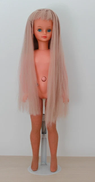 Le plus frappant ? Ses cheveux raides couleur fraise, qui sont TRÈS, TRÈS, TRÈS longs ! C'est du modacrylique de qualité, donc facile à coiffer. Elle est en taille 7/8, une taille assez courante pour beaucoup de poupées de collection.