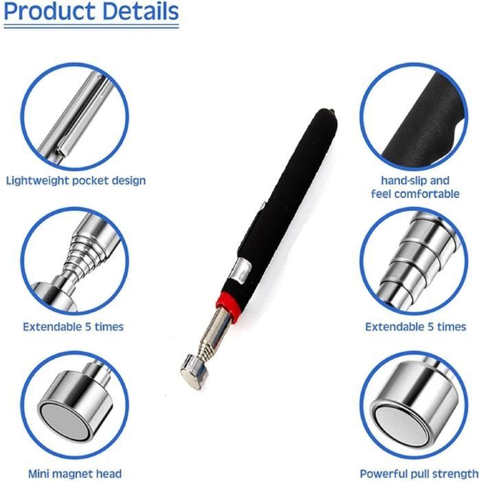 T'en as marre de perdre des vis ou des écrous dans des endroits inaccessibles ? Cette pince magnétique télescopique est ton nouveau meilleur ami ! Elle s'allonge jusqu'à 18 pouces (environ 45 cm) et se rétracte pour un rangement compact. L'aimant au bout est fort, pour ramasser facilement les objets métalliques. Elle est en acier inoxydable, de couleur argentée. Modèle : (31B-845). Elle est neuve, dans son emballage d'origine, et garantie 1 mois. Fabriquée en Chine. Attention : comme beaucoup d'objets contenant certains métaux, elle porte l'avertissement California Prop 65 (présence possible de DEHP, plomb...). Rien d'inquiétant pour une utilisation normale, mais lave-toi les mains après manipulation. UPC : 788012342836. Super pour le bricolage, la mécanique auto, l'électronique, ou juste pour récupérer quelque chose tombé derrière un meuble. Un outil pas cher mais hyper pratique !