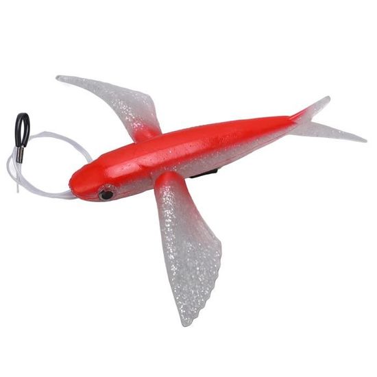 Un leurre souple hyper réaliste en forme de poisson volant (Flying Fish), d'une longueur de 8 pouces (environ 20 cm). Sa couleur est noir et argent, imitant parfaitement un petit poisson-appât. Il a une flottabilité neutre, ce qui signifie qu'il nage à une profondeur constante quand il est tracté (trolling). Conçu spécifiquement pour la pêche en mer (saltwater fishing) et le gros jeu (big game), il est parfait pour cibler des prédateurs comme le thon, le marlin, le mahi-mahi (dorade), le wahoo, l'espadon... Le matériau est du caoutchouc souple, très résistant aux morsures. Son poids est de 125 g, adapté pour la pêche au large (off-shore). Vendu à l'unité, neuf dans son emballage. Si tu es un pêcheur sportif qui pratique le trolling en mer, ce leurre est une valeur sûre dans ta boîte à leurres. Il produit un mouvement naturel très attractif. Attention, produit avec un avertissement California Prop 65 (présence possible de produits chimiques). Livraison rapide. Prépare-toi à des combats mémorables avec ce leurre de qualité !