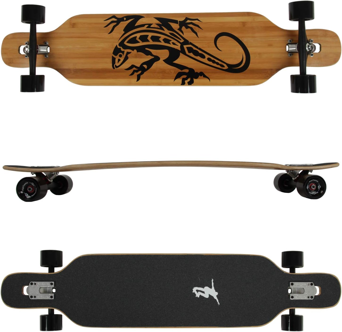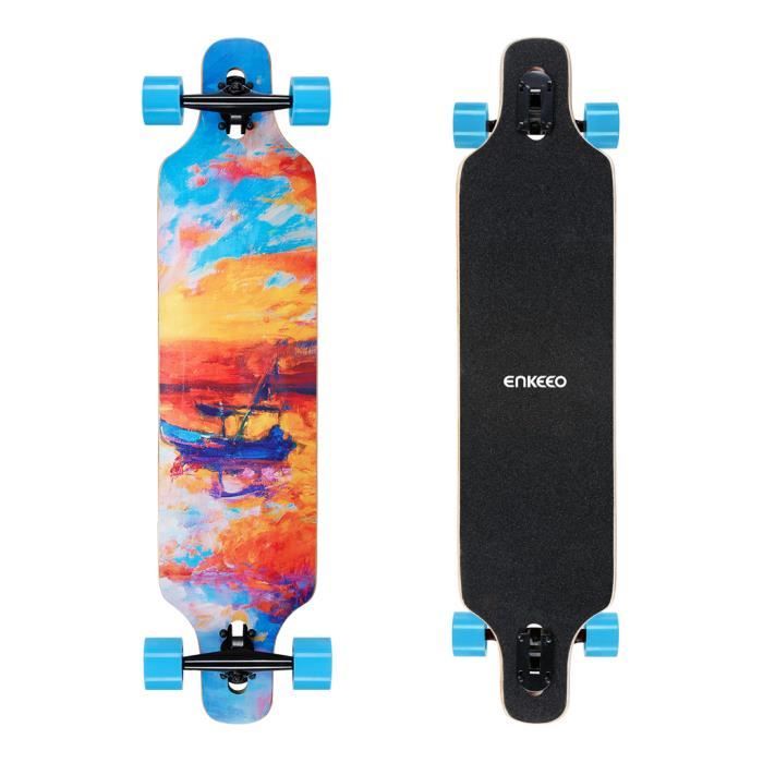 Hey les riders ! Ce longboard Magneto est un vrai beau modèle cruiser, parfait pour se déplacer en ville ou se balader sur le plat. Le deck (plateau) fait 44 pouces de long (environ 112 cm) et 9 pouces de large. Il est construit en 7 plis de bois, mélange d'érable dur et de bambou, ce qui donne une planche à la fois solide, légère et avec un bon flex. Il a un kicktail à l'arrière, pratique pour manœuvrer et faire de petits tricks. Les roues sont en polyuréthane, diamètre 70mm, idéales pour avaler les petits défauts du bitume. Portance max : 275 livres (environ 125 kg). Poids de la planche : 9.5 livres (environ 4.3 kg). Neuf, dans sa boîte d'origine. Un longboard fiable, au look nature avec le bois apparent, pour rider en style et en confiance. UPC : 850002911411.