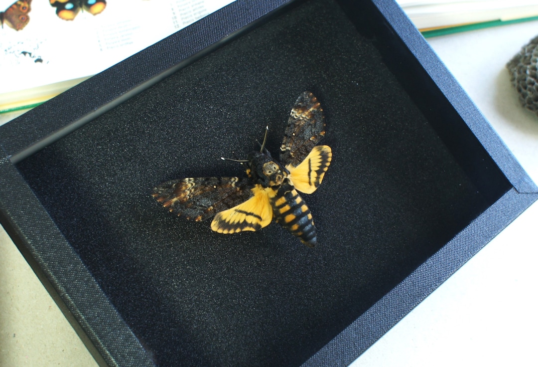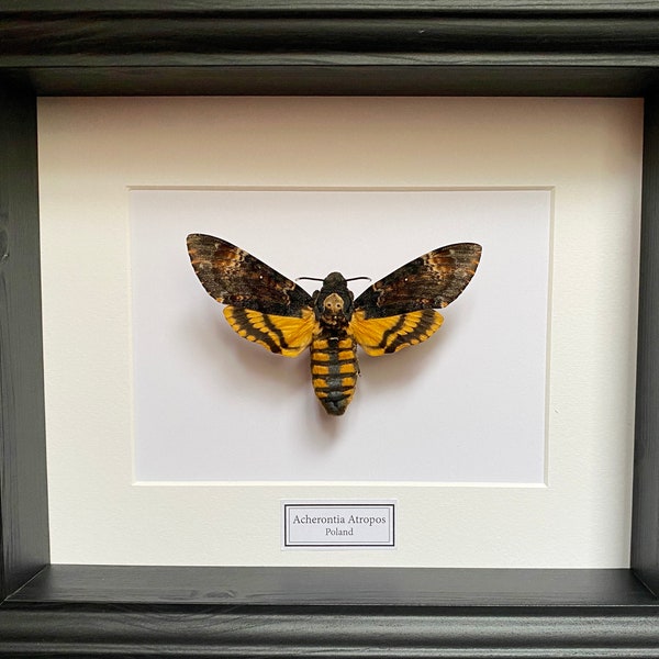 Bonjour aux amateurs de curiosités naturelles ! Ce cadre boîte à ombre présente un magnifique sphinx à tête de mort (Acherontia atropos), monté sur fond en bois. Dimensions environ 18 cm. L’insecte est réel, préparé avec soin, et l’ensemble est neuf, jamais exposé. Fabriqué au Royaume-Uni. Parfait pour décorer un bureau, un cabinet de curiosités, ou offrir à un passionné de biologie/entomologie. Le sphinx à tête de mort est célèbre pour son motif crânien sur le thorax – une pièce fascinante et conversationnelle. Livraison soignée et protégée. Attention : article fragile, à manipuler avec précaution. Un vrai morceau de nature chez vous !
