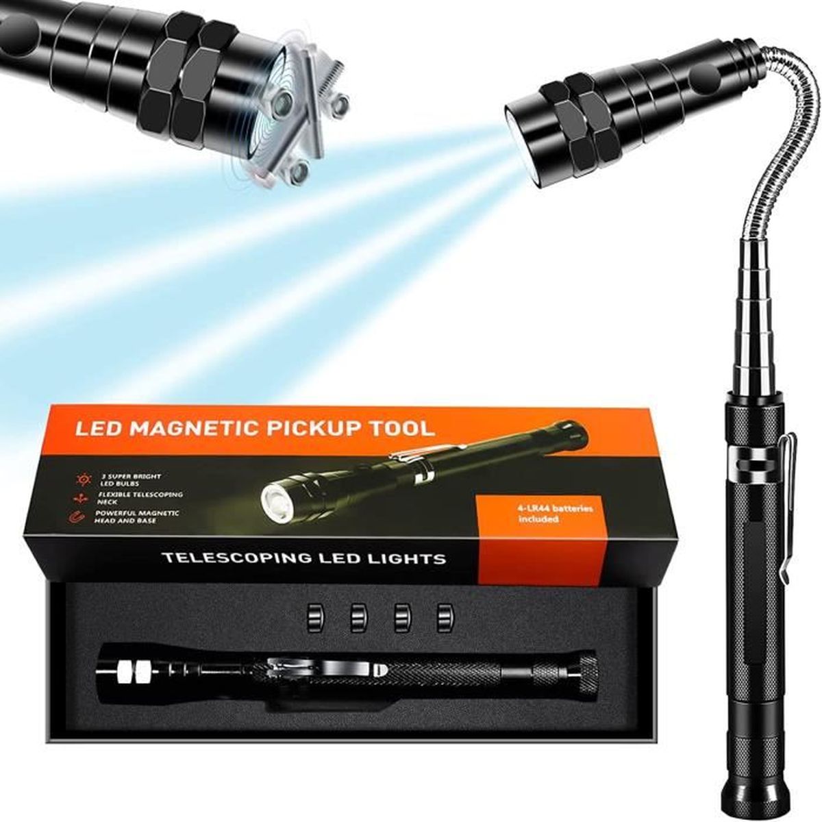 Bonjour les bricoleurs et mécanos ! Ce petit outil est ultra pratique : c'est un ramassoir magnétique télescopique qui s'allonge pour atteindre les endroits inaccessibles. En plus, il a 3 LED intégrées qui éclairent directement la zone de travail, parfait pour retrouver un écrou tombé dans un recoin sombre du moteur. La tige est flexible, vous pouvez la courber pour aller chercher précisément. Il est neuf, dans son emballage. Marque générique, mais très utile dans la trousse à outils, à la maison ou au garage. Plus besoin de se contorsionner !